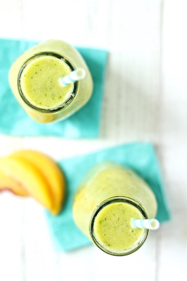 If you haven’t already noticed, I’ve been a smoothie-making goddess for the last several months. I’ve tested healthy smoothie recipes to the moon and back, and this green mango peach smoothie is one of my all-time favorite summer drinks! I originally came up with a similar smoothie recipe for my new eBook Smoothies & Smoothie Popsicle Recipes For Toddlers and Kids (available on Amazon now!). Since it’s 185 degrees outside, I wanted to create a minty smoothie with peaches and fresh ginger, and BOY does this one satisfy!!!