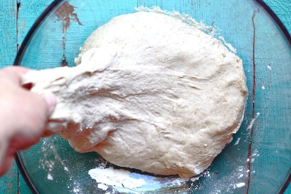 - Remove the dough from the mixing bowl and reserve the towel. Cut the dough into 8 pieces and cover with the towel while shaping so it doesn't form a skin on top.