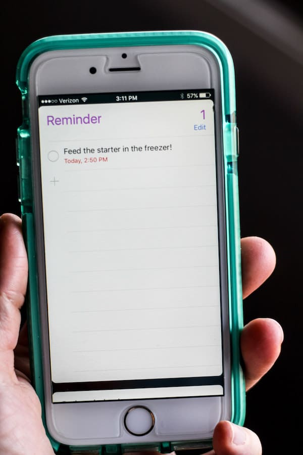 - Put a reminder on your phone! It’s so easy to forget about your starter in the fridge as it gets pushed to the back, and even more in the freezer. So make it easy to remember. Put it on your physical calendar or whatever online calendar you use regularly.