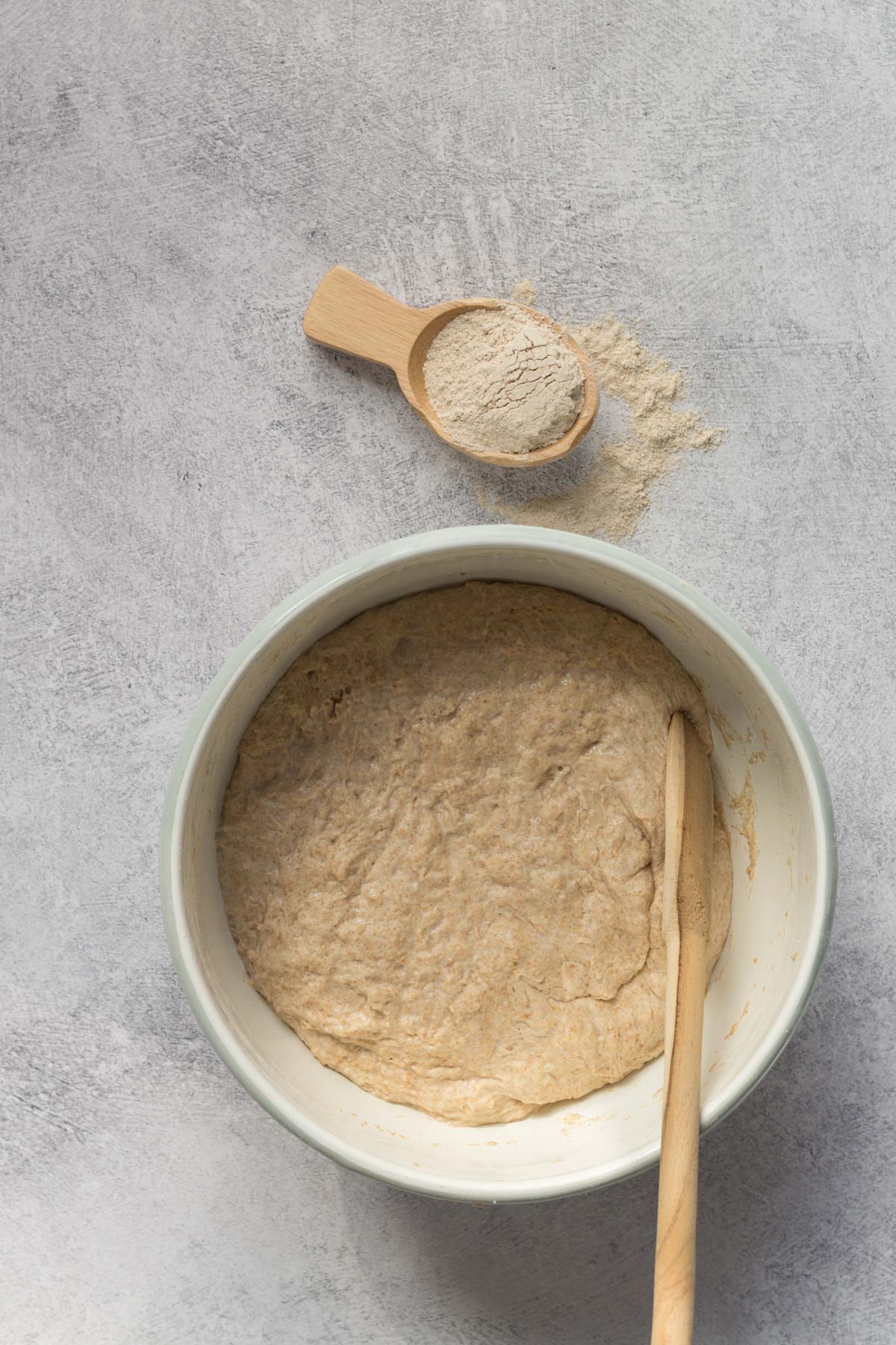 - Add the water and sourdough culture/starter and stir with a wooden spoon or spatula until combined. If the dough looks a bit dry, you can add an extra tablespoon of water at a time because whole wheat flour absorbs a lot of water. You don't have to knead the dough because the long fermentation will create the structure you need.