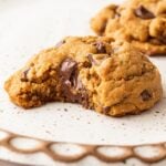Fold in the chocolate chips until just combined. I like to reserve a few chocolate chips to press into the tops of the cookies before baking.